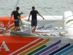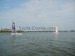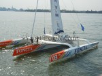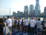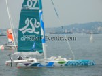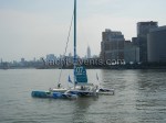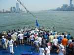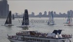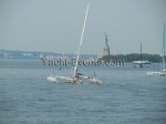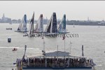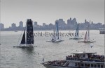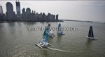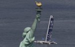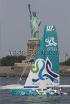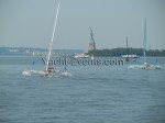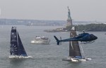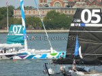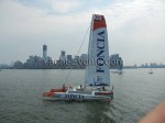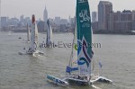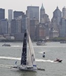 Winds were only light on New York’s hottest day of 2012 so far, with only the occasional puff to send the fleet of five MOD70’s en route, though the strong contrary current made life hard when the giant mulihulls stuck to the water.