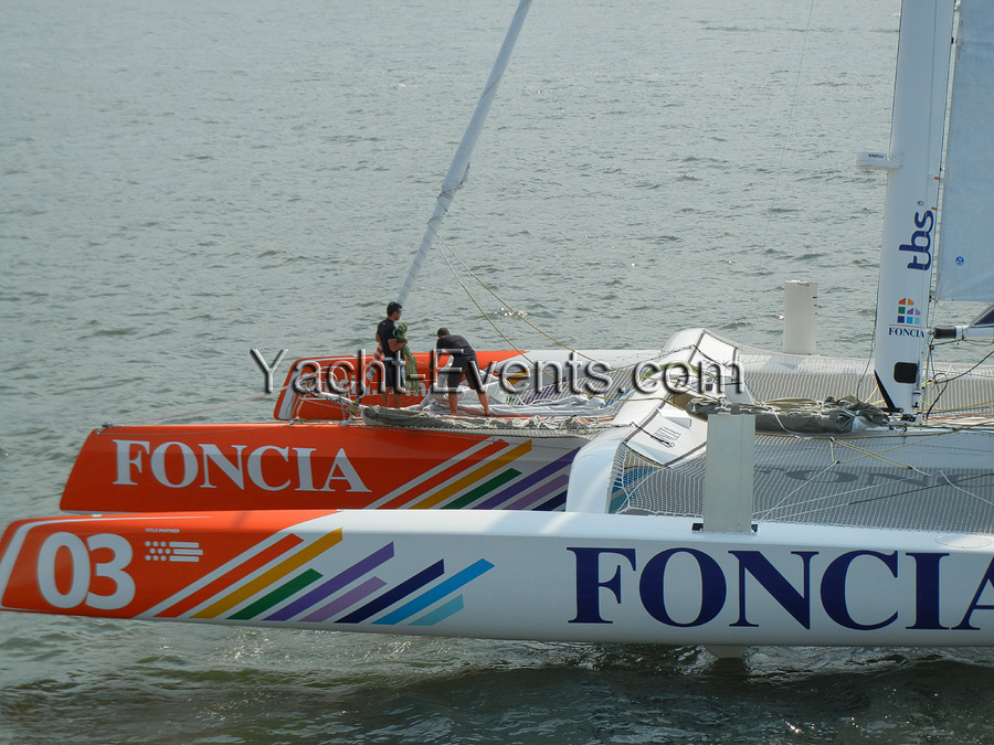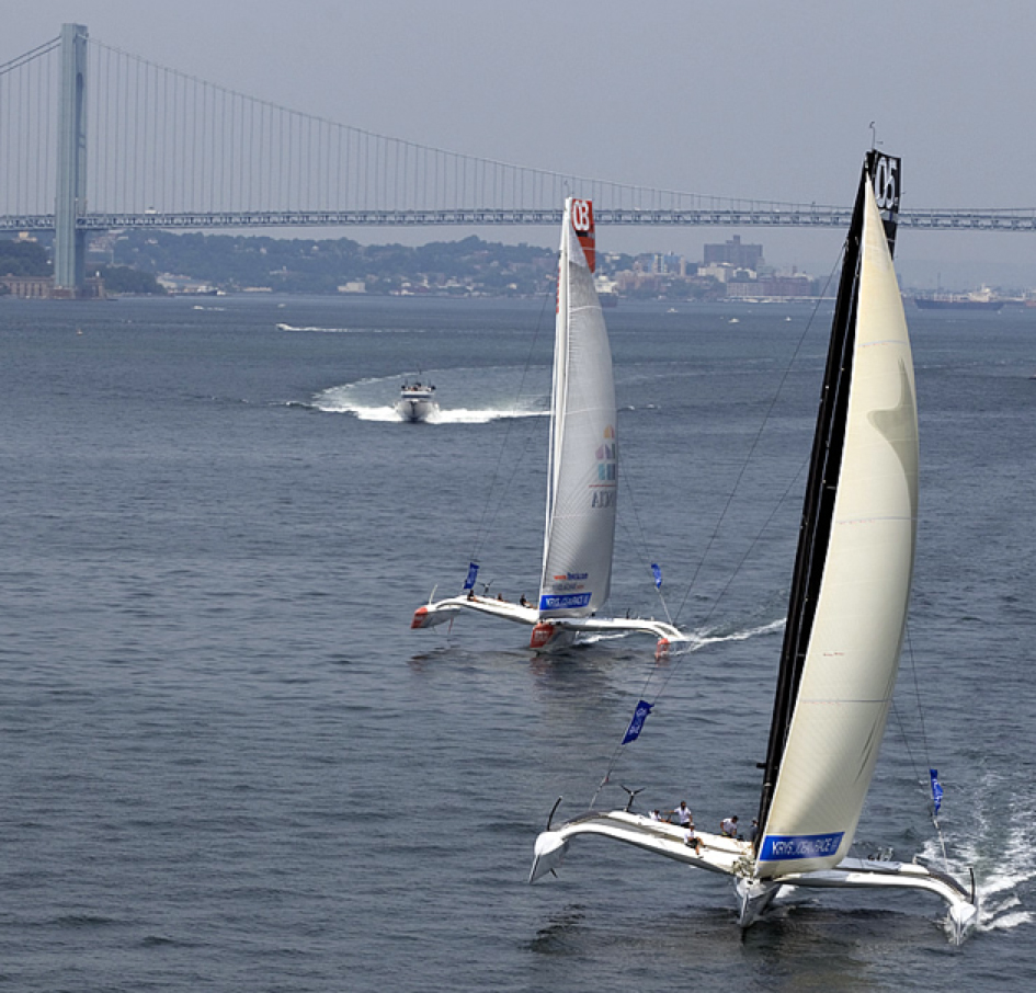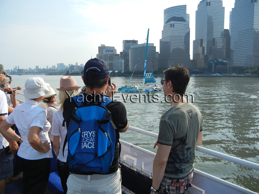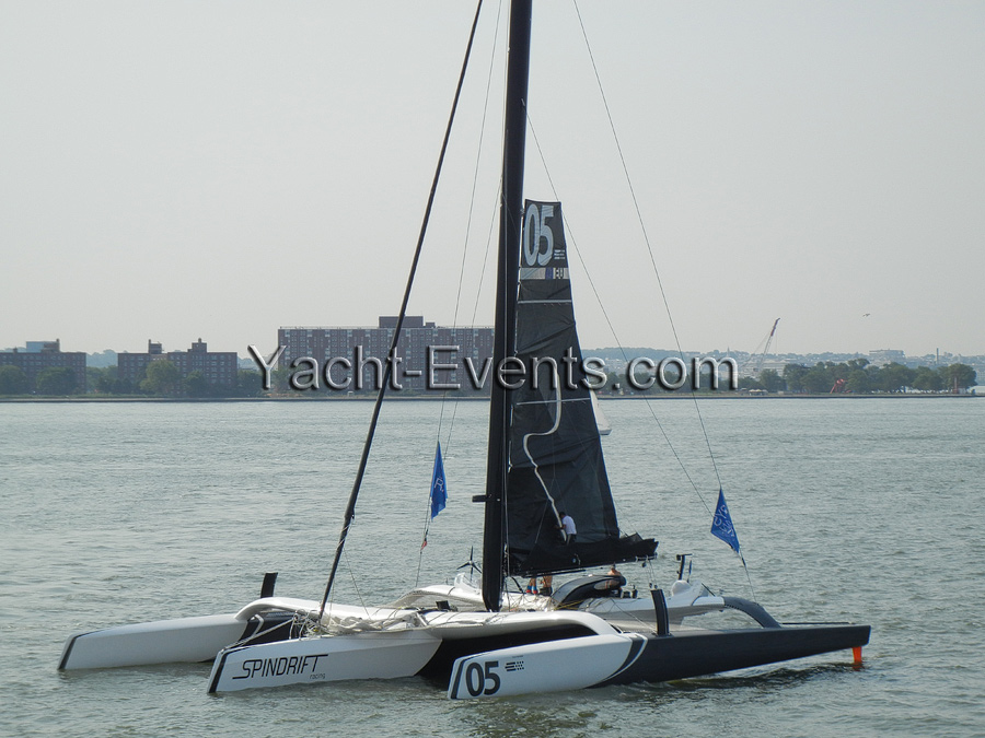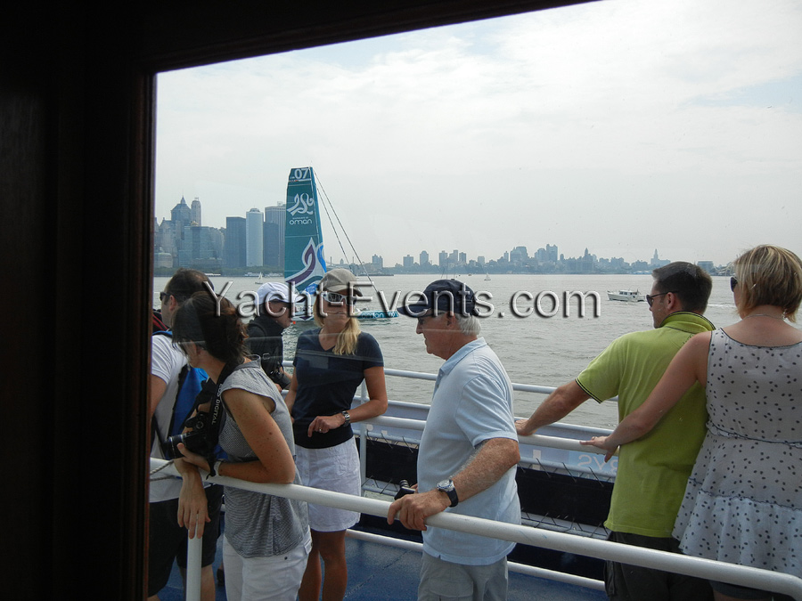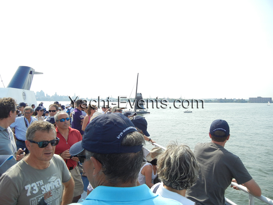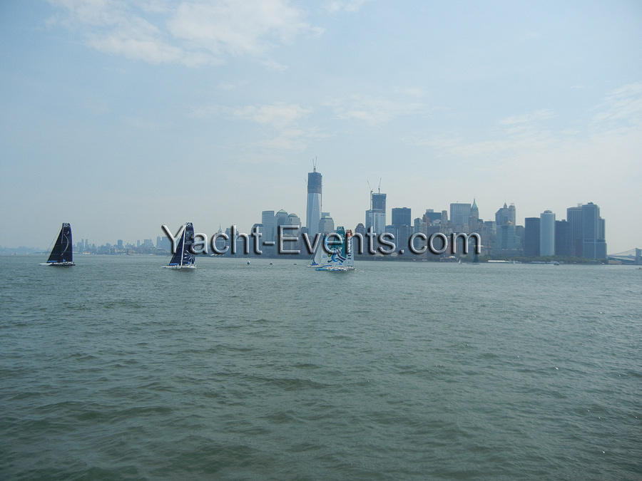 Winds were only light on New York’s hottest day of 2012 so far, with only the occasional puff to send the fleet of five MOD70’s en route, though the strong contrary current made life hard when the giant mulihulls stuck to the water.
