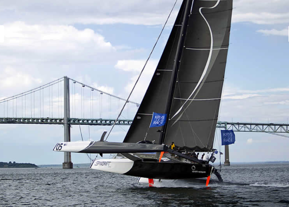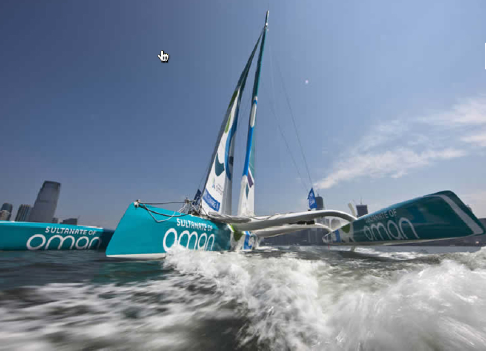 Though they all compressed again at the upriver turning mark, set off the North Cove Marina, Groupe Edmond de Rothschild rebuilt their margin when they stuck to the Jersey shore and slid away, leading Musandam-Oman Sail out to towards the Atlantic.